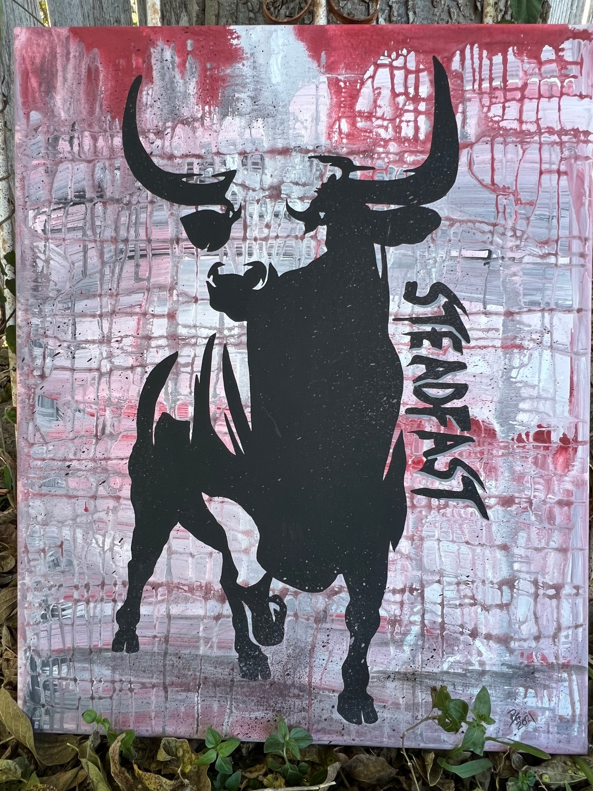 A pour paint background with multi colors of black, red, white. and gray. The bull reminds us to stand strong, steadfast. Acrylic paints were used to create this inspiring painting, size 16" x 20" stretched canvas. The word painted on the canvas is "Steadfast".