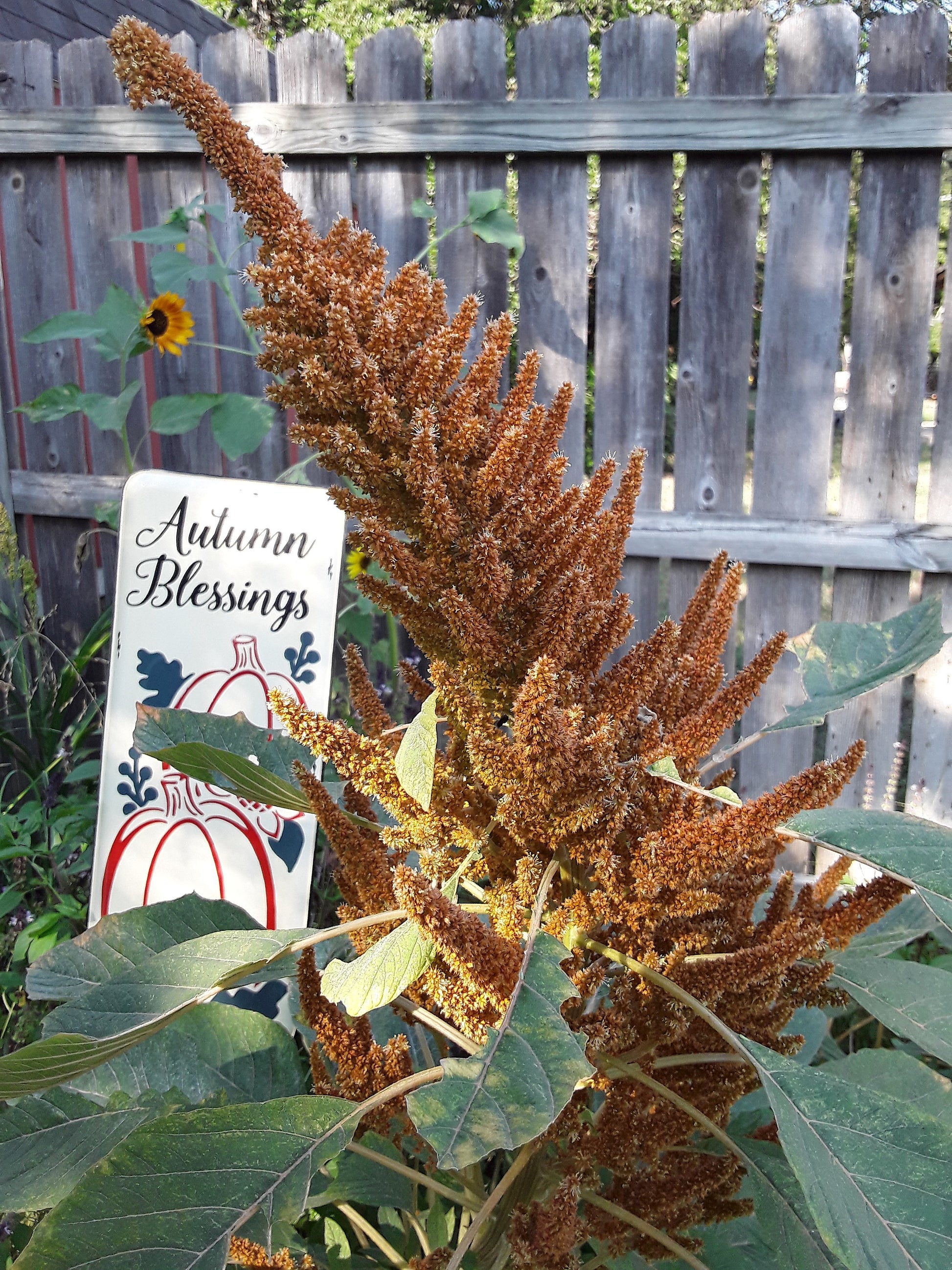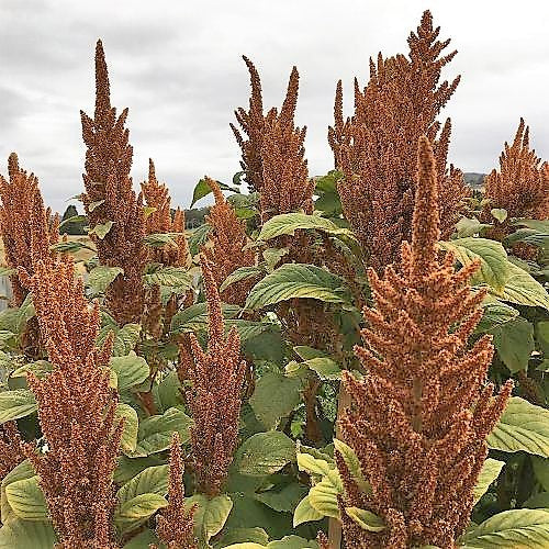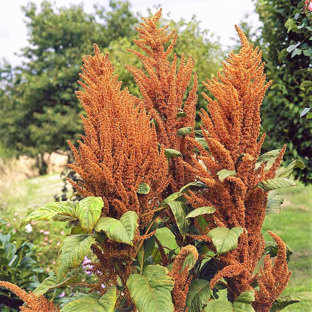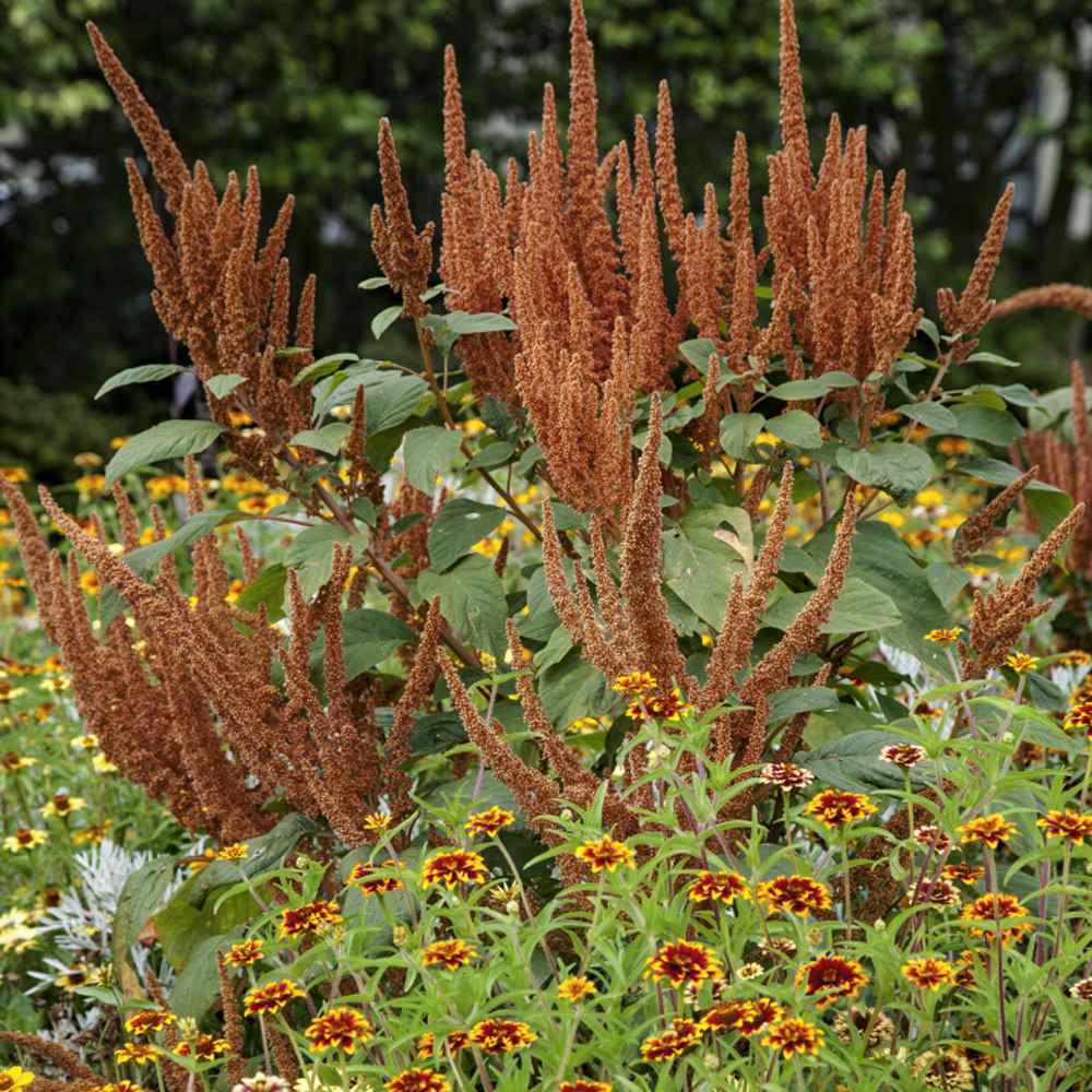 Prolific and easy-to-grow filler plant or stunning garden border plant. Amaranthus 'Hot Biscuits' is a splendid ornamental addition to the garden and for flower arrangements. This gorgeous and graceful amaranth feature bold spikes of coppery-bronze to chestnut colored branching plumes that rise above the foliage from early summer to mid autumn and are ideal for autumn bouquets and bunches. Pinching out the center (apical) bud is recommended for optimum branching. It attracts pollinators like crazy.