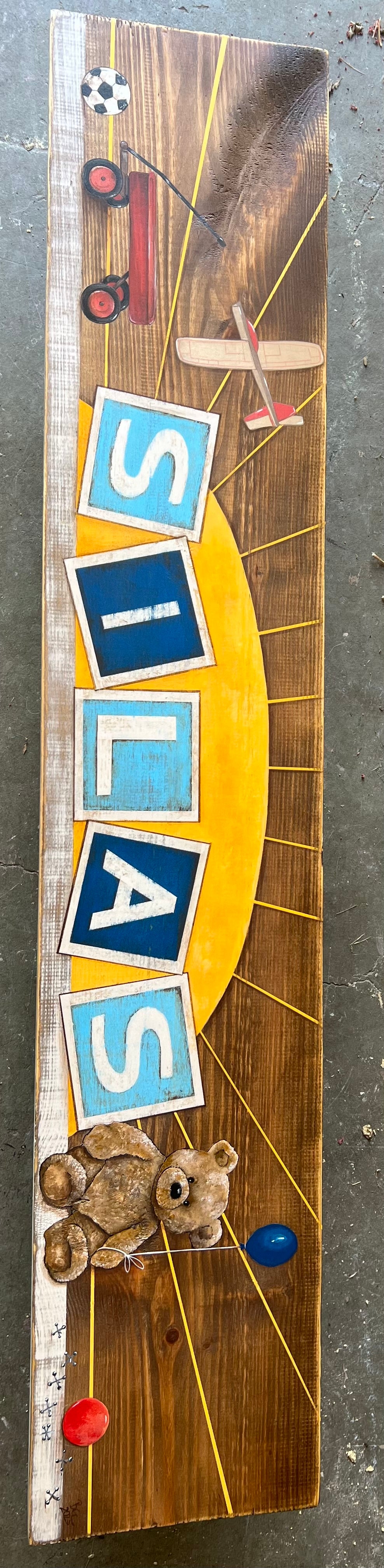 Custom order baby’s nursery sign. This sign is hand painted on stained wood size approximately 37 1/2” long x 9 1/4” wide x 3/4” thick. Two picture hangers are attached to back of sign for hanging. I can do up to 6 letters without losing some of the artwork.