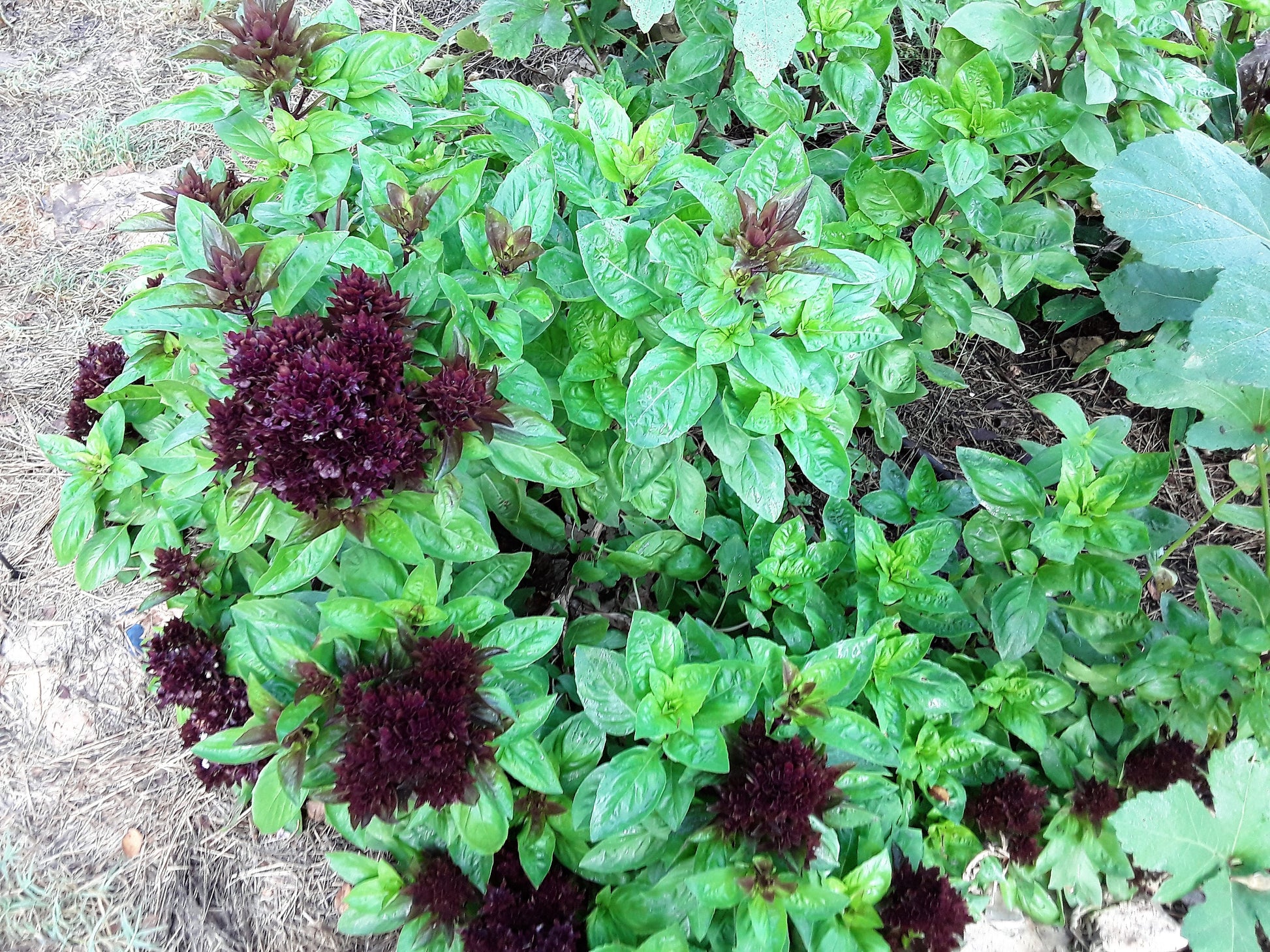 Edible ornamental with showy flowers. Very uniform, upright habit. Flat, 2-3" long leaves that are larger than typical Thai types; purple stems and dark, purple-red flower bracts. Cinnamon/clove flavor with hints of anise. Slower growing and slow to bolt; needs a long, warm season for cut-flower use.