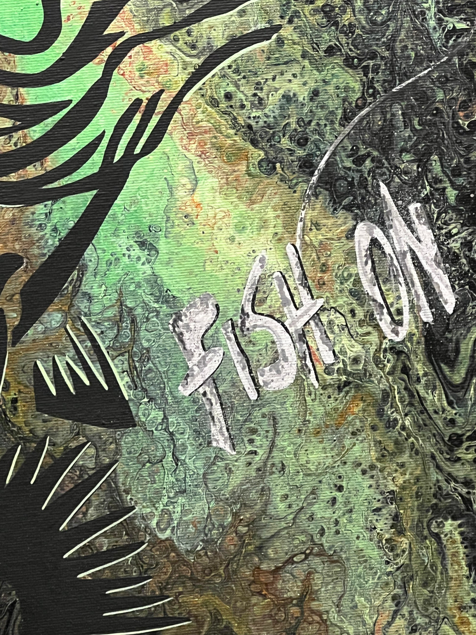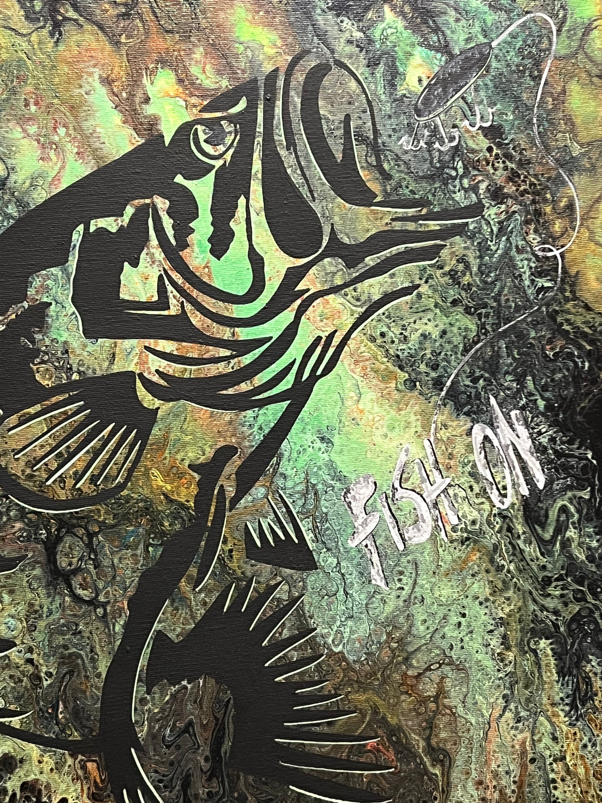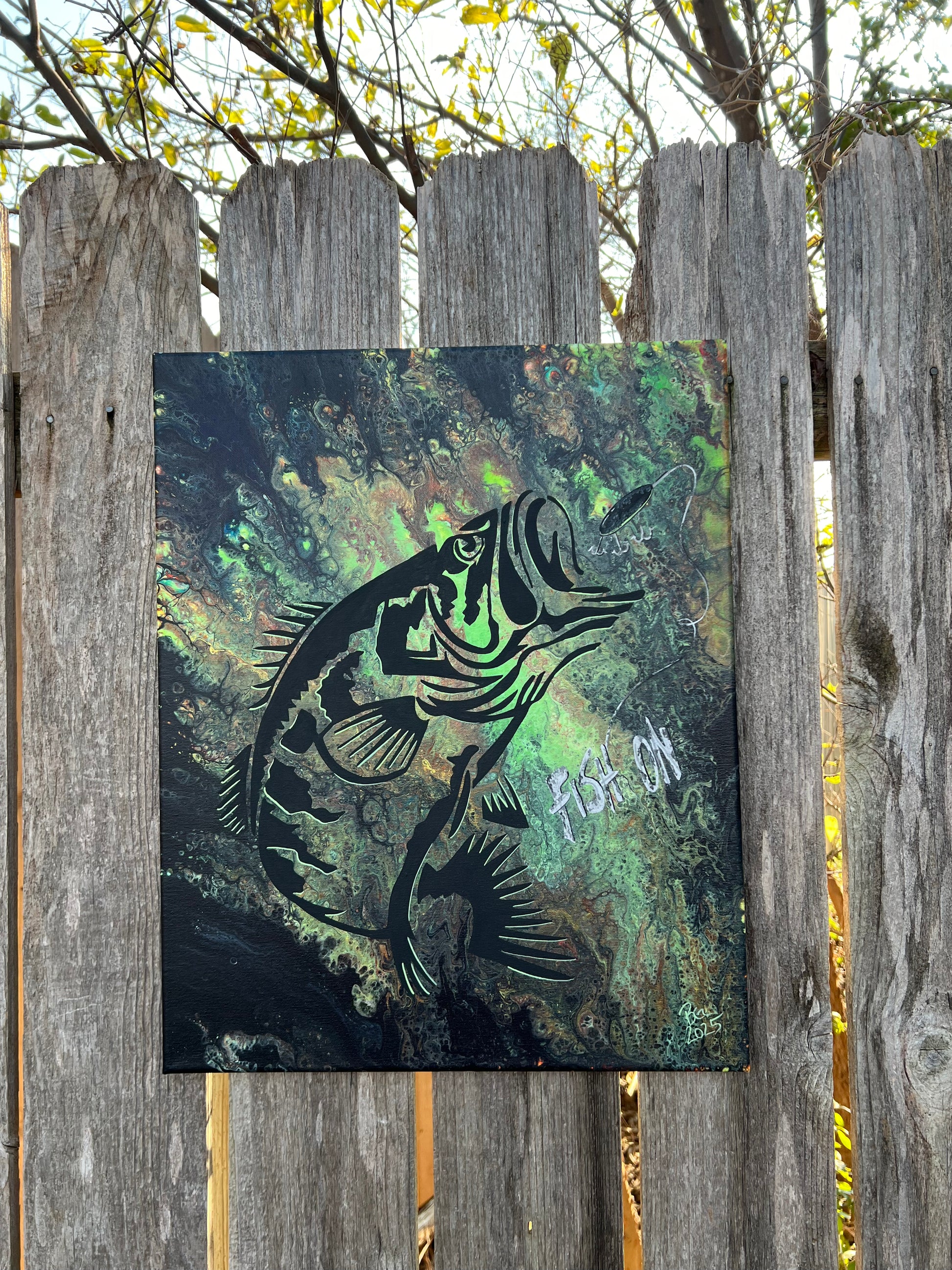 Fish On painting is a bass silhouette created on top of a pour paint background. The painting was done in beautiful shades of black, green, gold, gray and black.
