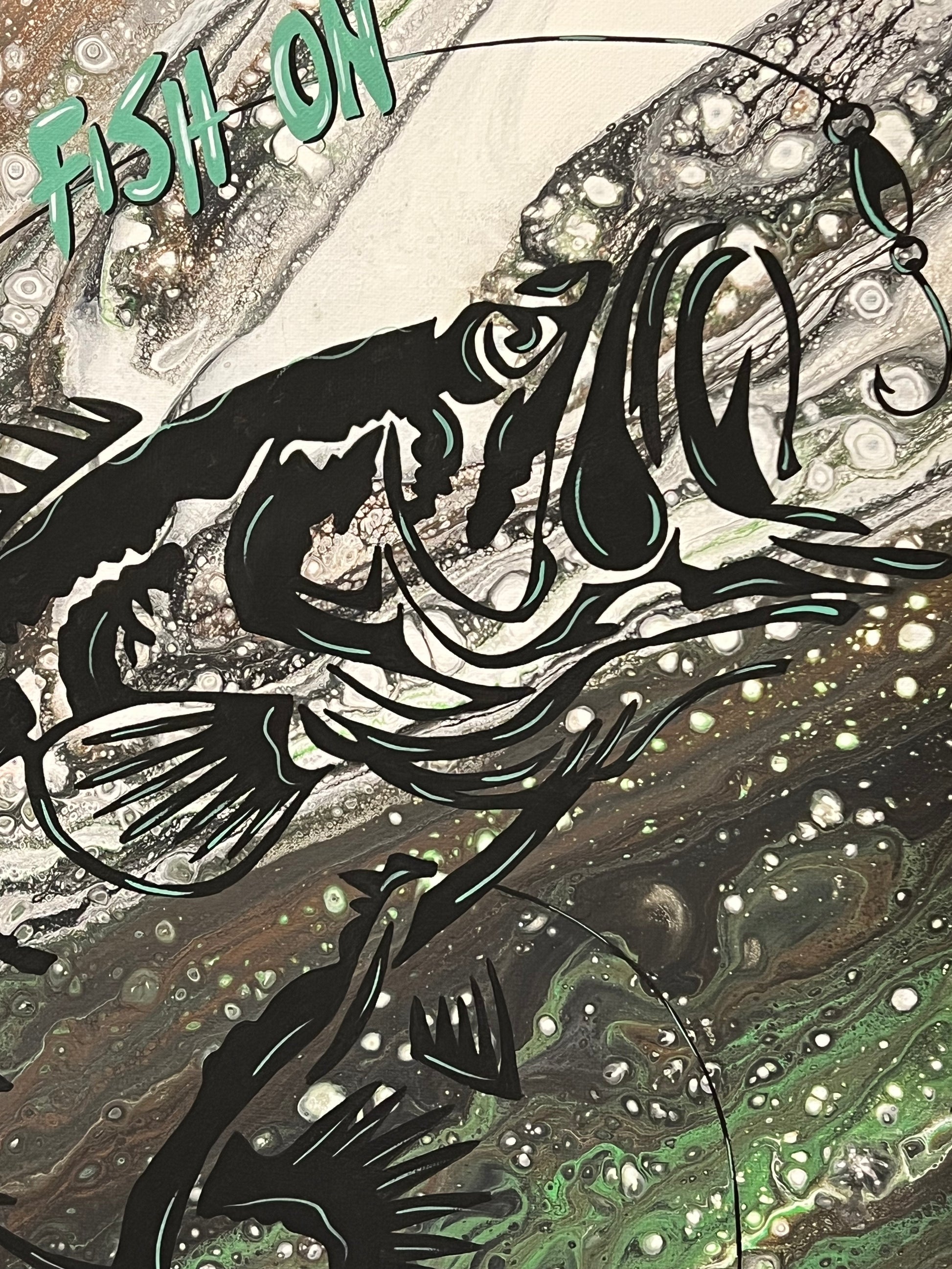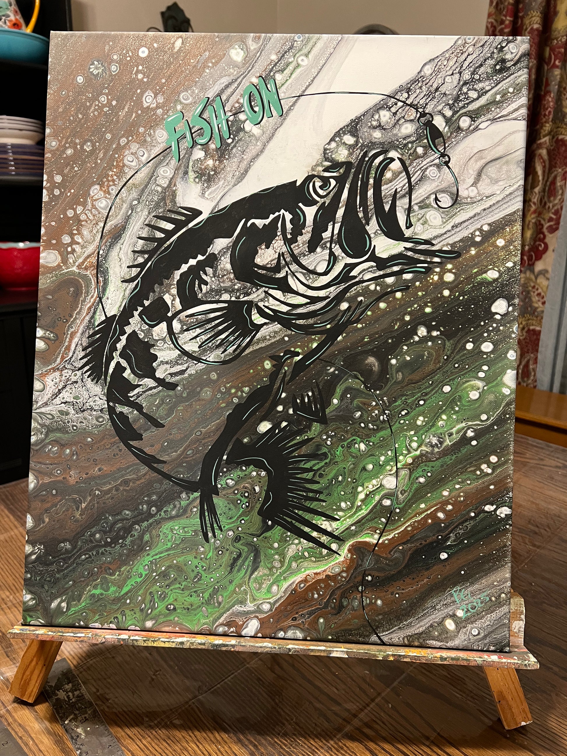Fish painting is a bass silhouette created on top of a pour paint background. The painting was done in beautiful shades of black, white, green and brown.