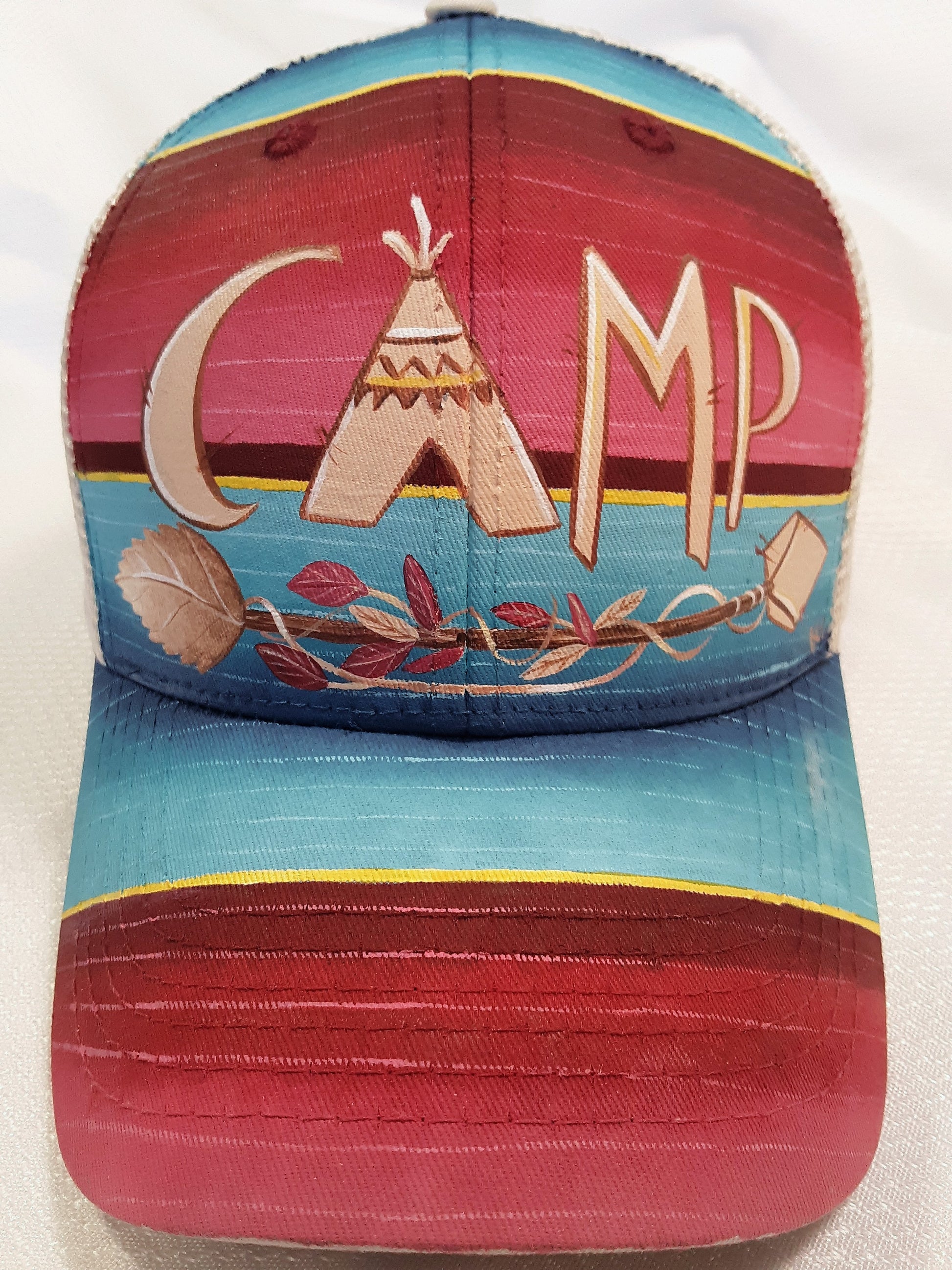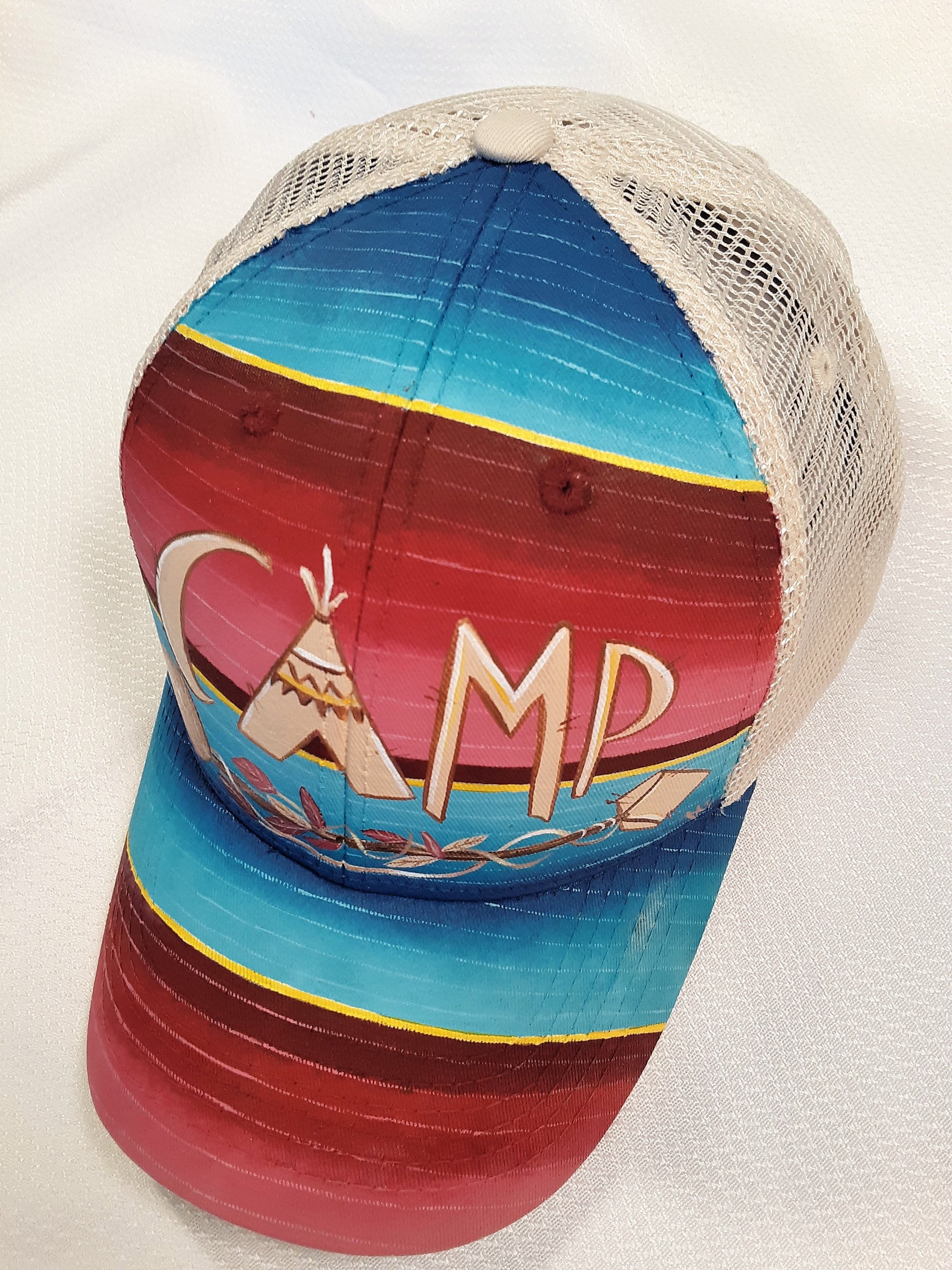 Keep the sun off your face in style with this Camp Serape Trucker Cap! The bright, bold colors and font will have you camper-cool and looking sharp. Get yourself noticed with an extra dash of sass!!