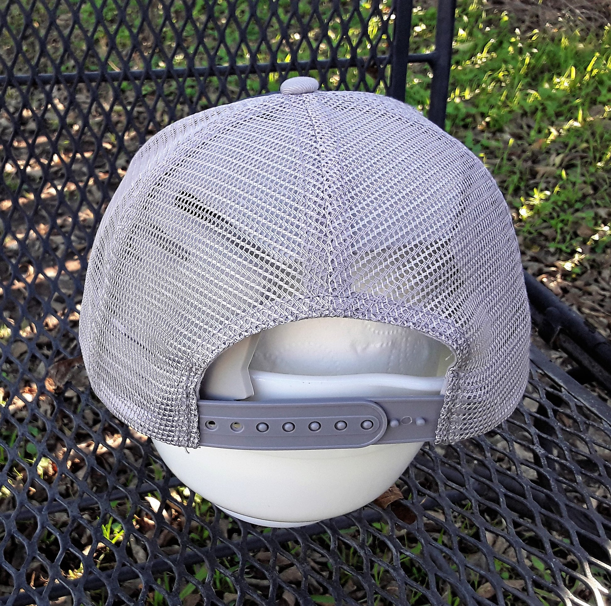 The Adult cap is a 6 Panel Trucker Ball Cap, plastic adjustable strap in back.
