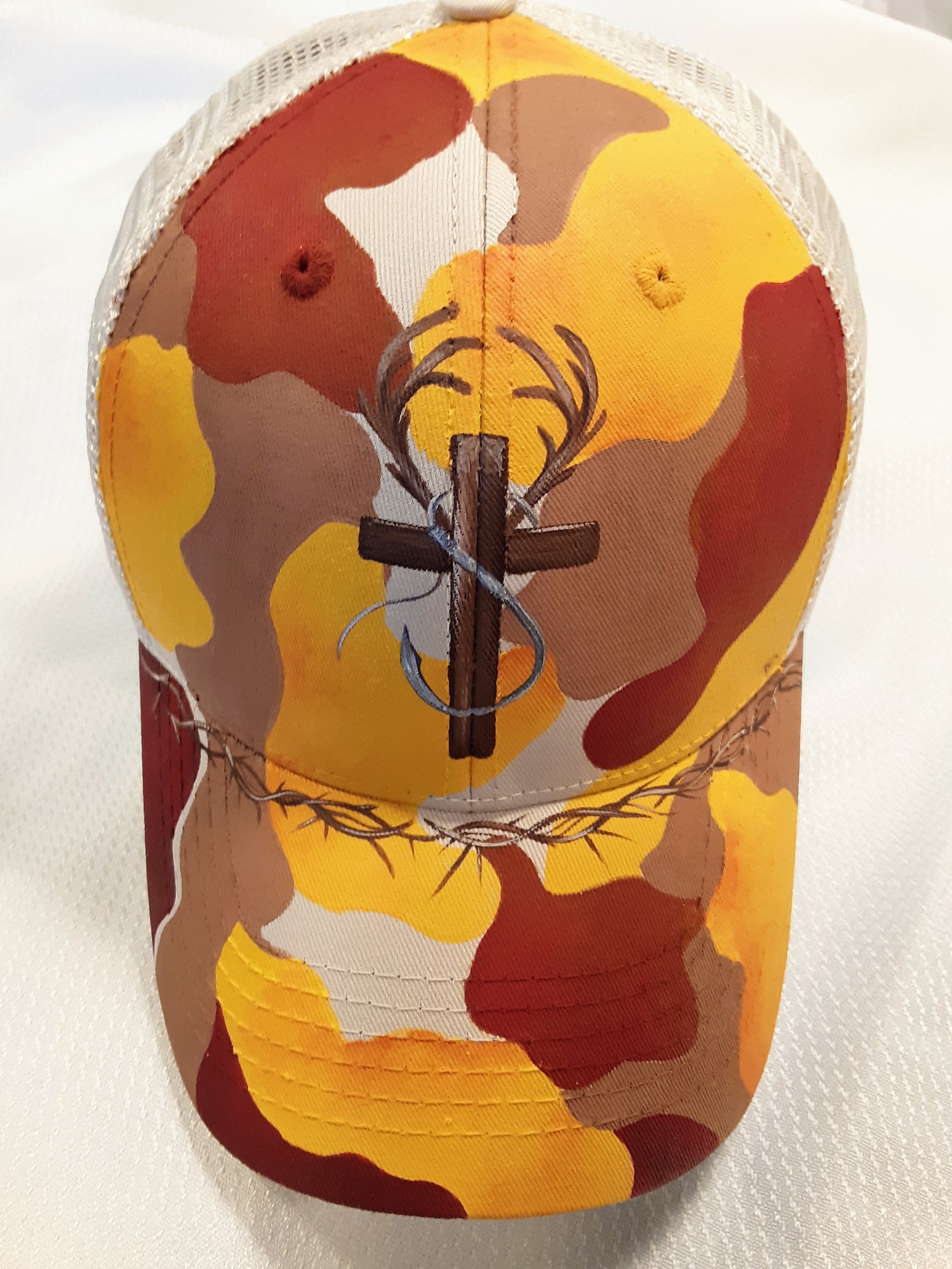 This Camo Hunt Fish Rust Trucker Cap is the perfect way to make your outdoor look pop! Its bold camo rust and orange design features a cross, hunter, and fisherman symbols, meaning you can show off your true outdoorsman (or woman!) style. Get your cap on and hit the trails!