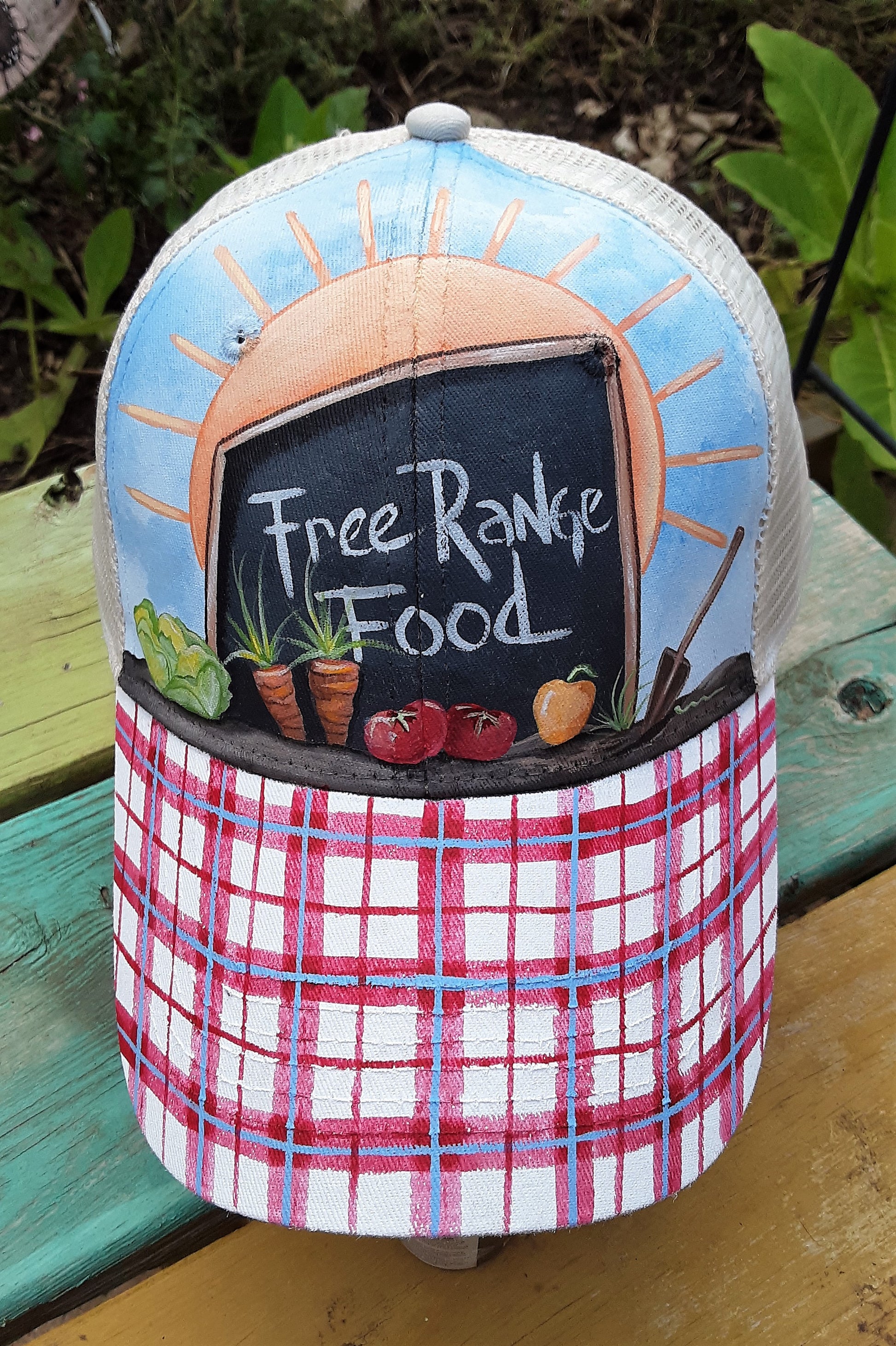 Take your style to new heights with this one of a kind Free Range Food Trucker Cap! Featuring a beautiful hand-painted ball cap with a garden scene, this Homestead Baseball Cap is sure to make heads turn. Perfect for green thumbs and novice gardeners alike! Order yours today and get growing in style!