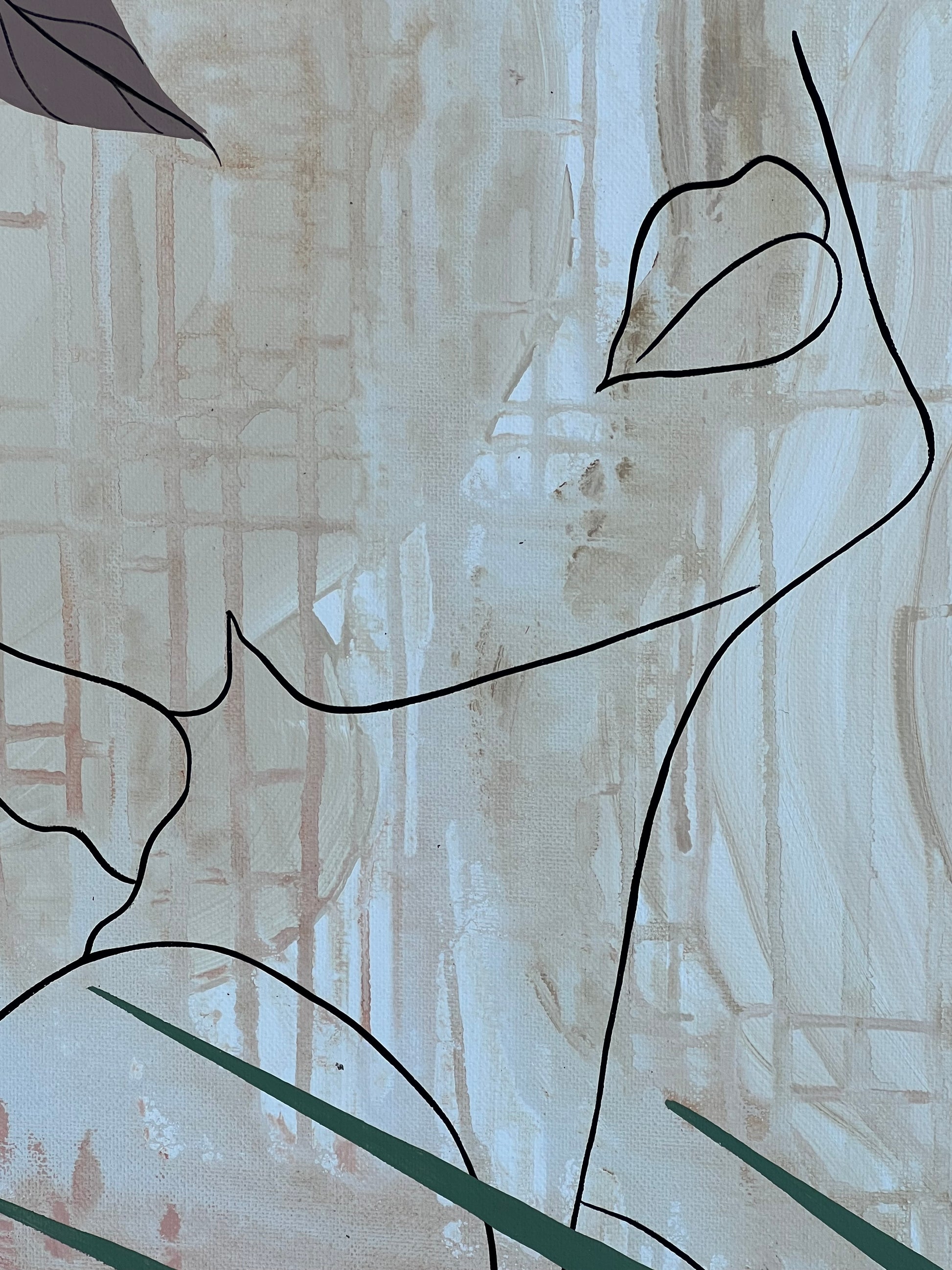 A pour paint background with multi colors of tan, white and peach. This minimalist woman painting reminds us to KIS, Keep It Simple. Acrylic paints were used to create this inspiring painting, size 16" x 20" stretched canvas.