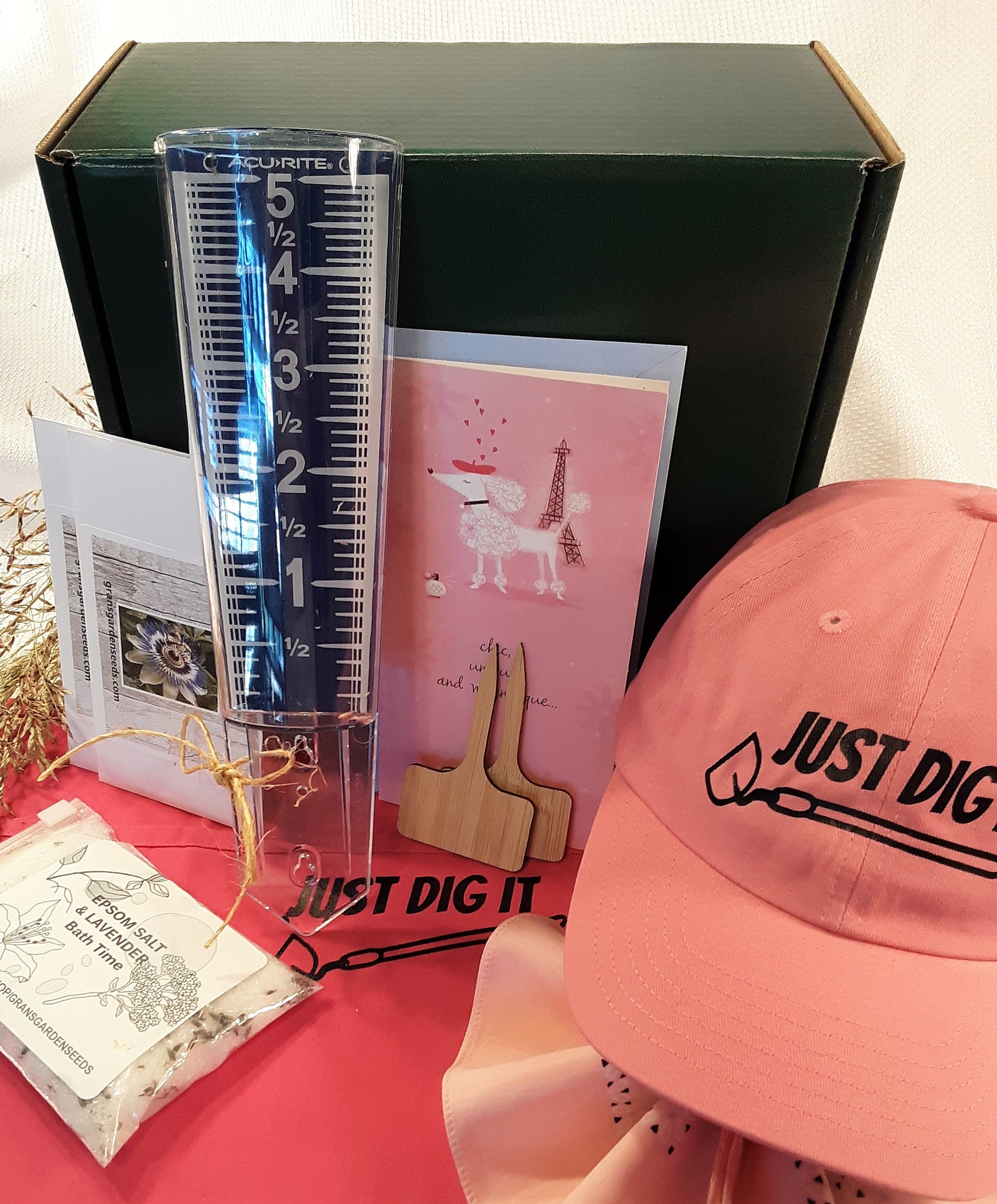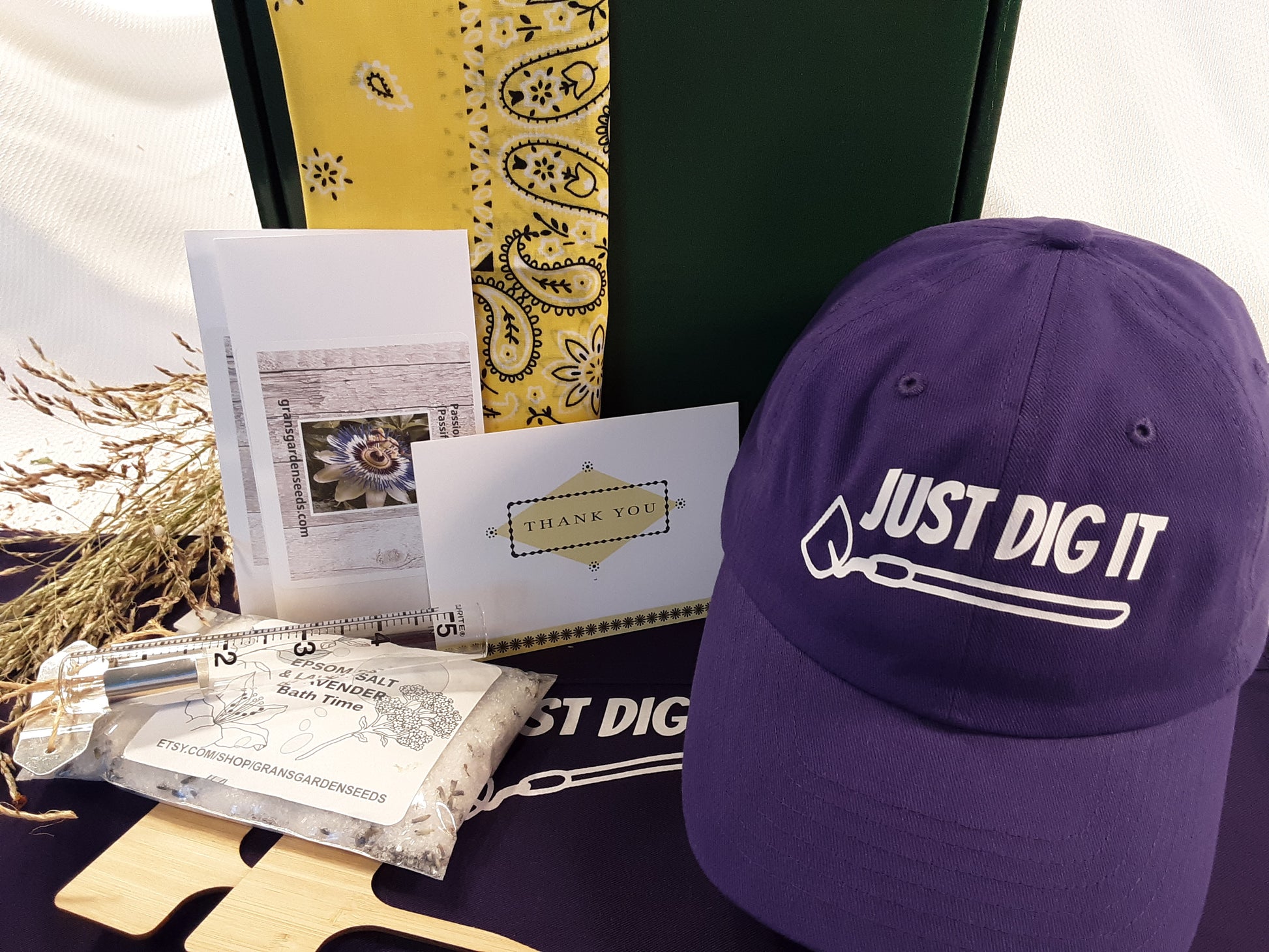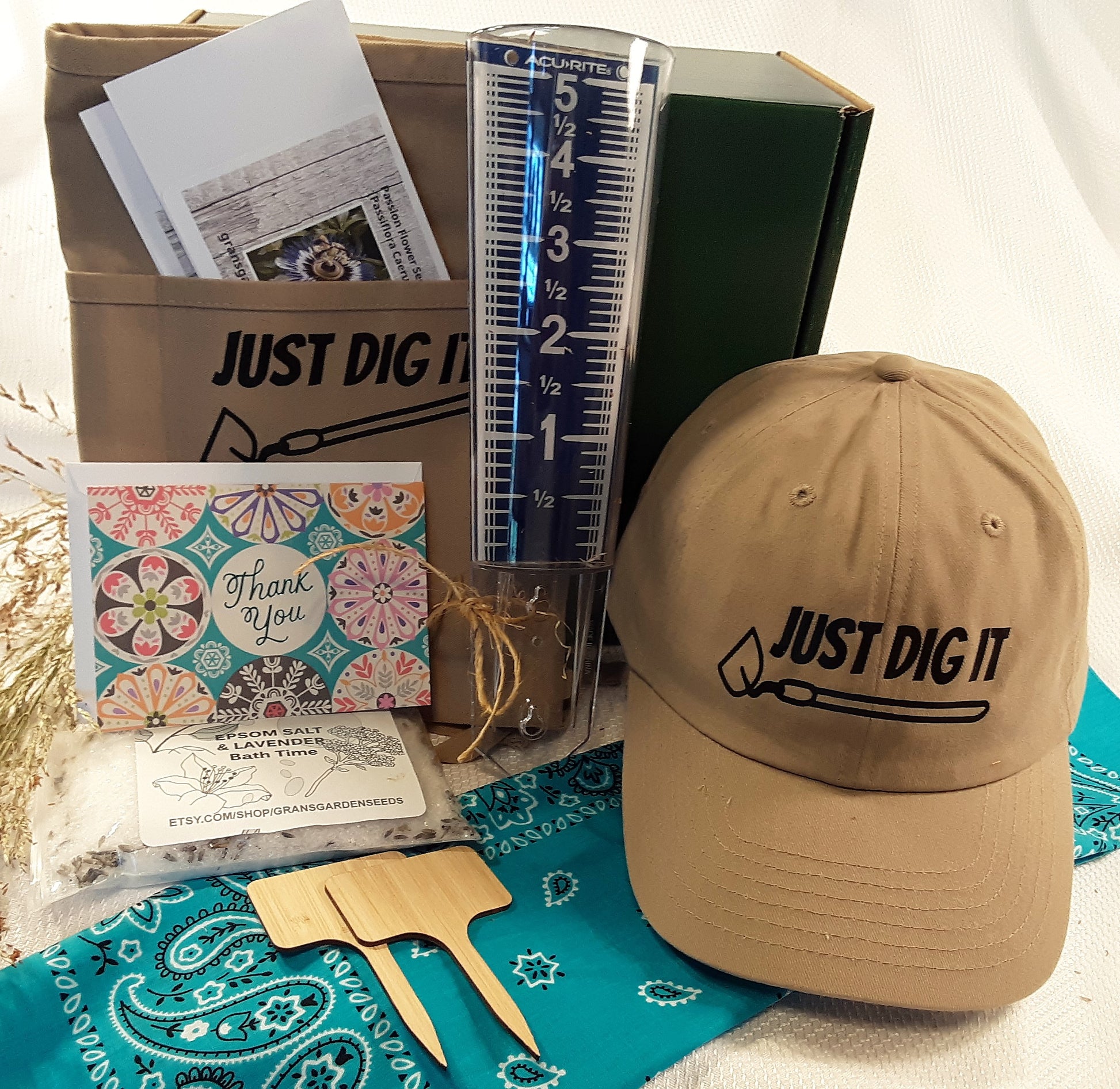 1 six panel brushed twill unstructured cap with JUST DIG IT logo, 1 three pocket waist apron with logo, 1 cotton bandana, 2 seed packages with instructions, 2 seed/plant markers, 1 rain gauge, 1 lavender scented Epsom salt bag-8oz, 1 greeting card based on occasion, and a 10 % off gift coupon from Gran's Garden Seeds Shop for your recipient.