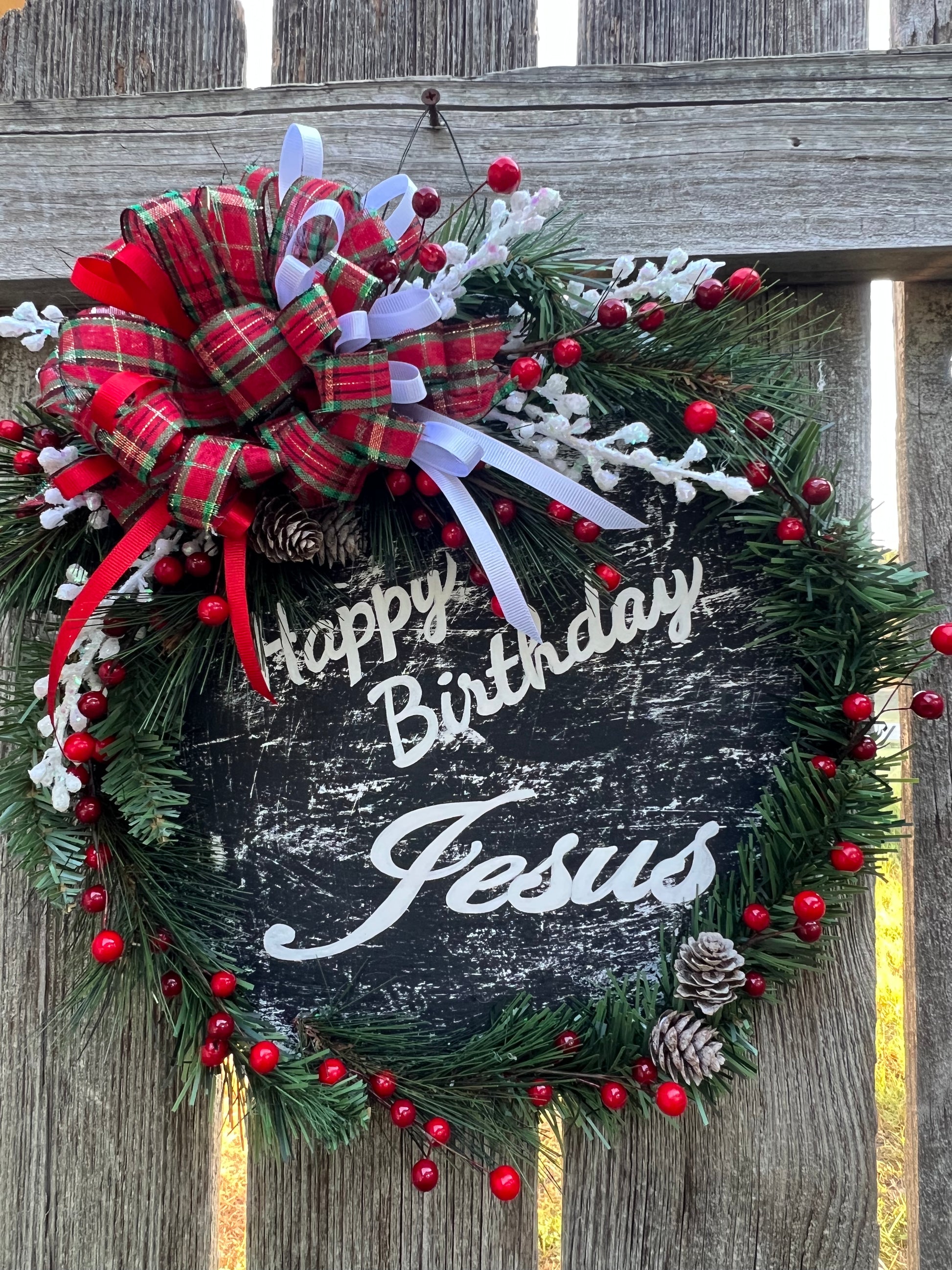 A beautiful 14” Christmas door wreath with the words Happy Birthday Jesus.