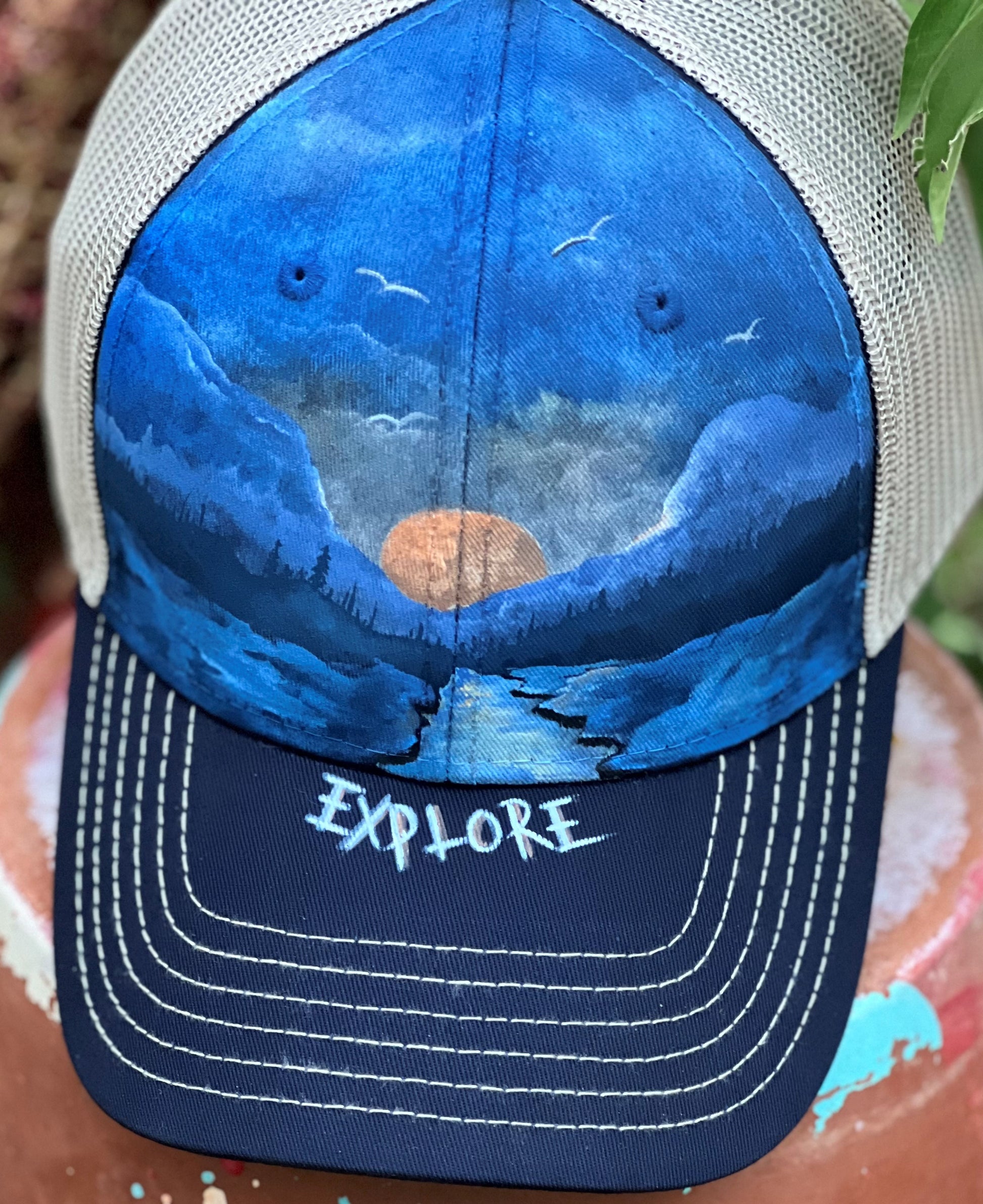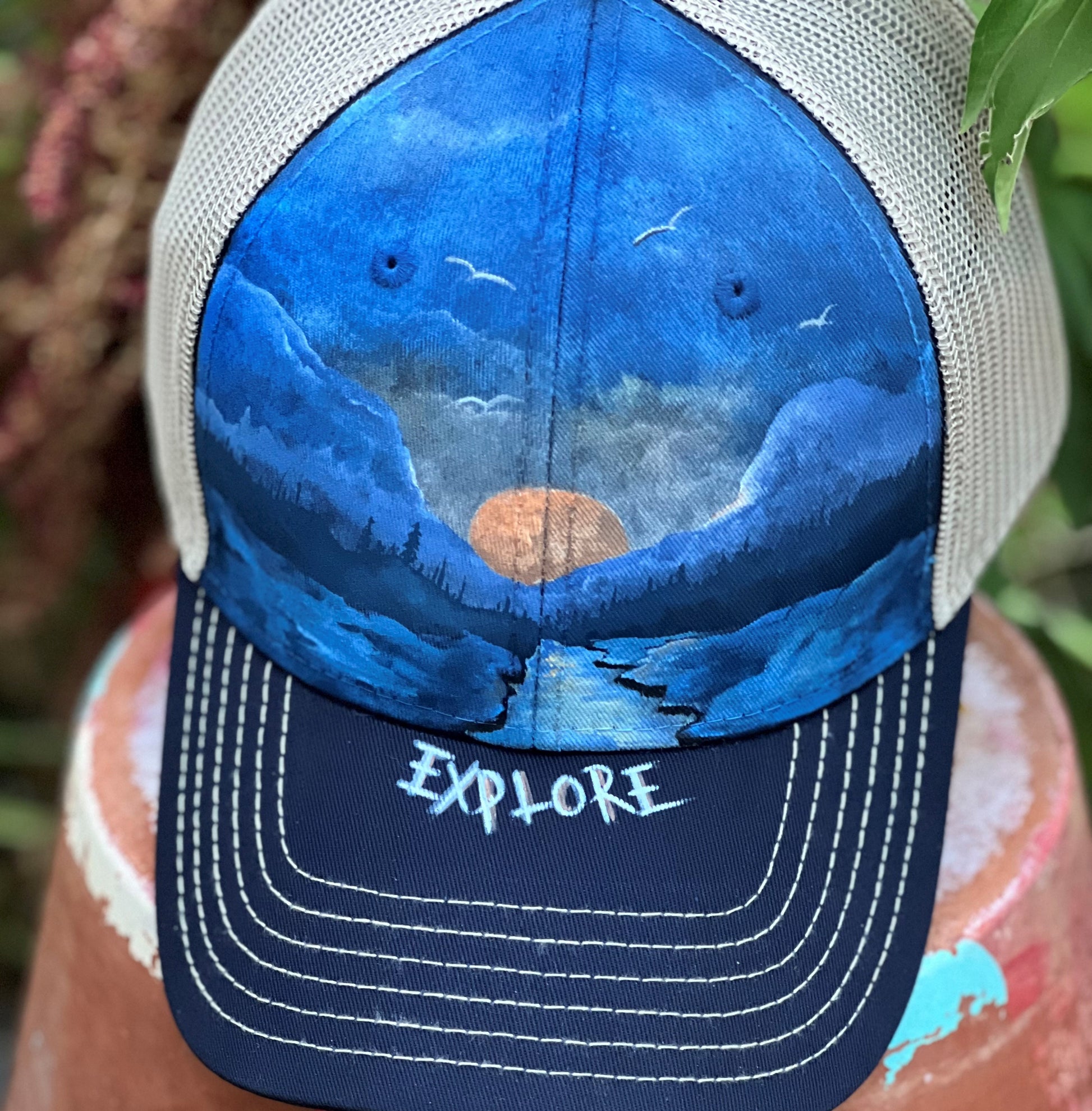 Discover your wild side with this majestic Explore Trucker Cap. Perfectly painted with a mountain scene, it expresses the beauty of nature and your adventurous spirit! With its bold "Explore" font, this stunning cap will take your outdoor excursions to the next level!