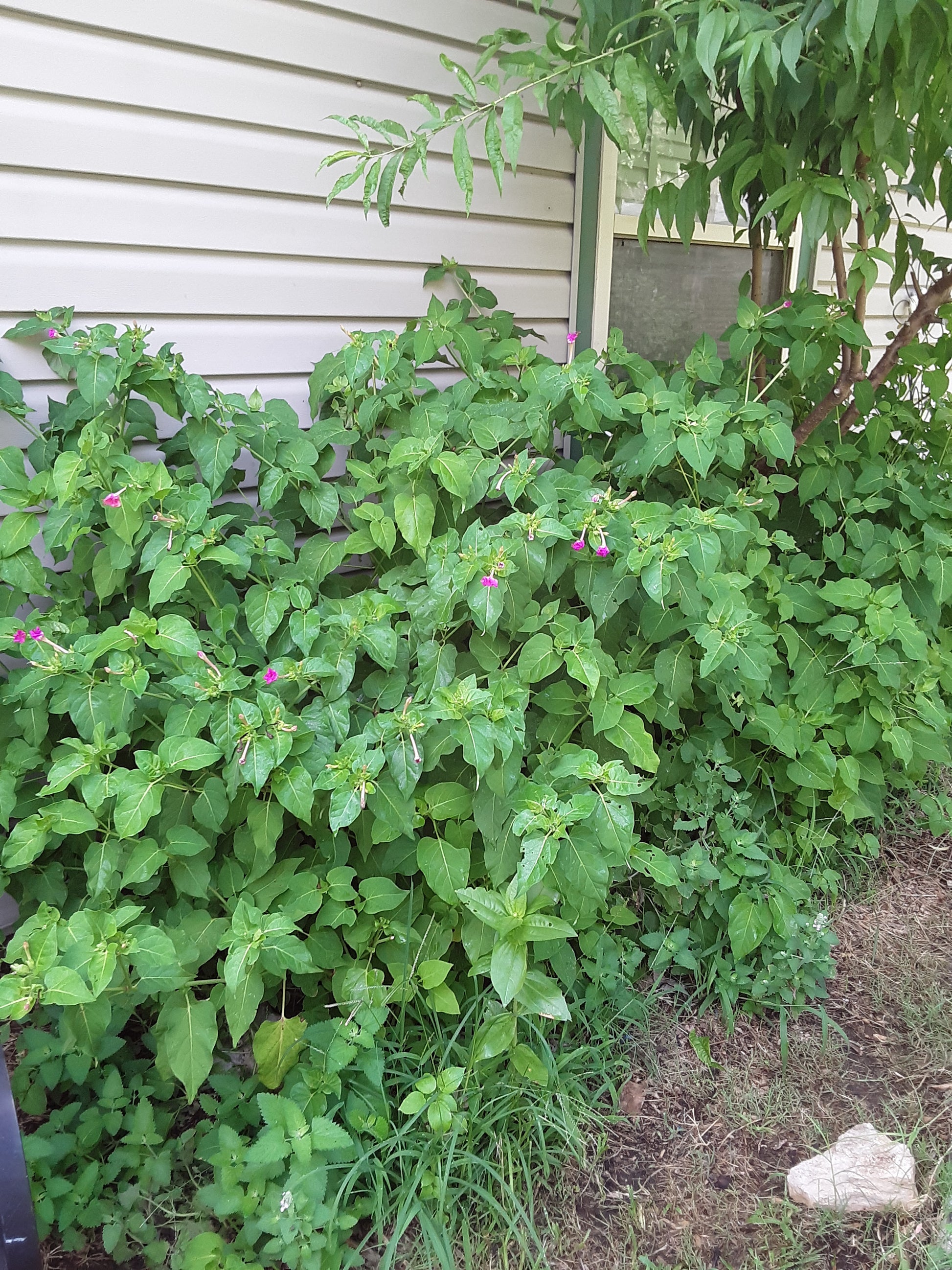 Four O’ Clock flowers only open in the afternoon or on cloudy days but the aroma is worth the wait. They grow very bushy and full of fuchsia color flowers. Plants often self-sow. The roots form tubers that may be dug up and stored over the winter. Shorter varieties are fine for containers. Plants are heat and drought tolerant, but when the temps stayed in the high 90's (plus) I gave them a drink every morning and they did very well.