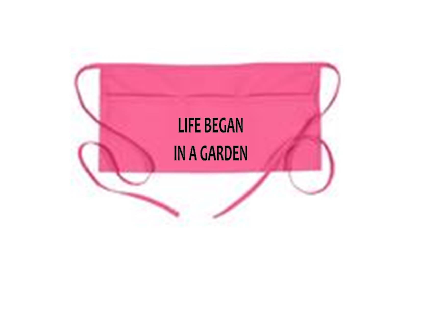 The Waist Apron (3 Pockets) with the words "Life Began In The Garden" and features an ultra-durable fabric. A great gift for your favorite gardener or for you!
