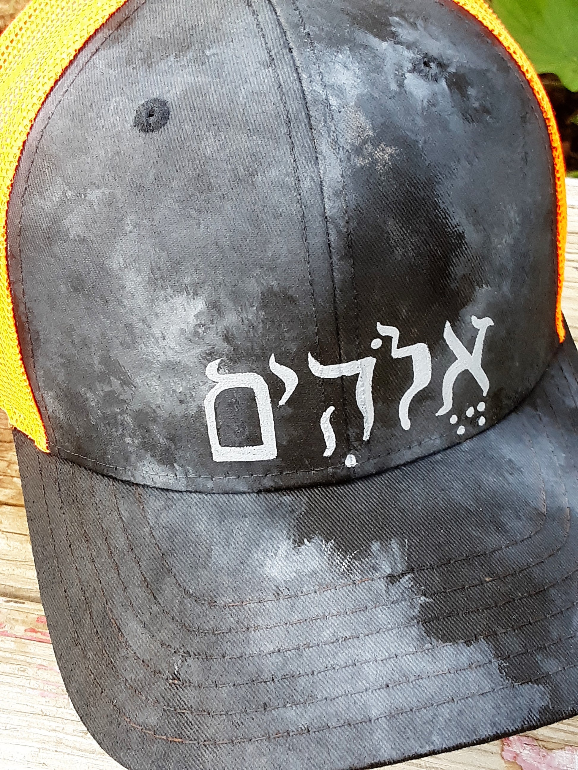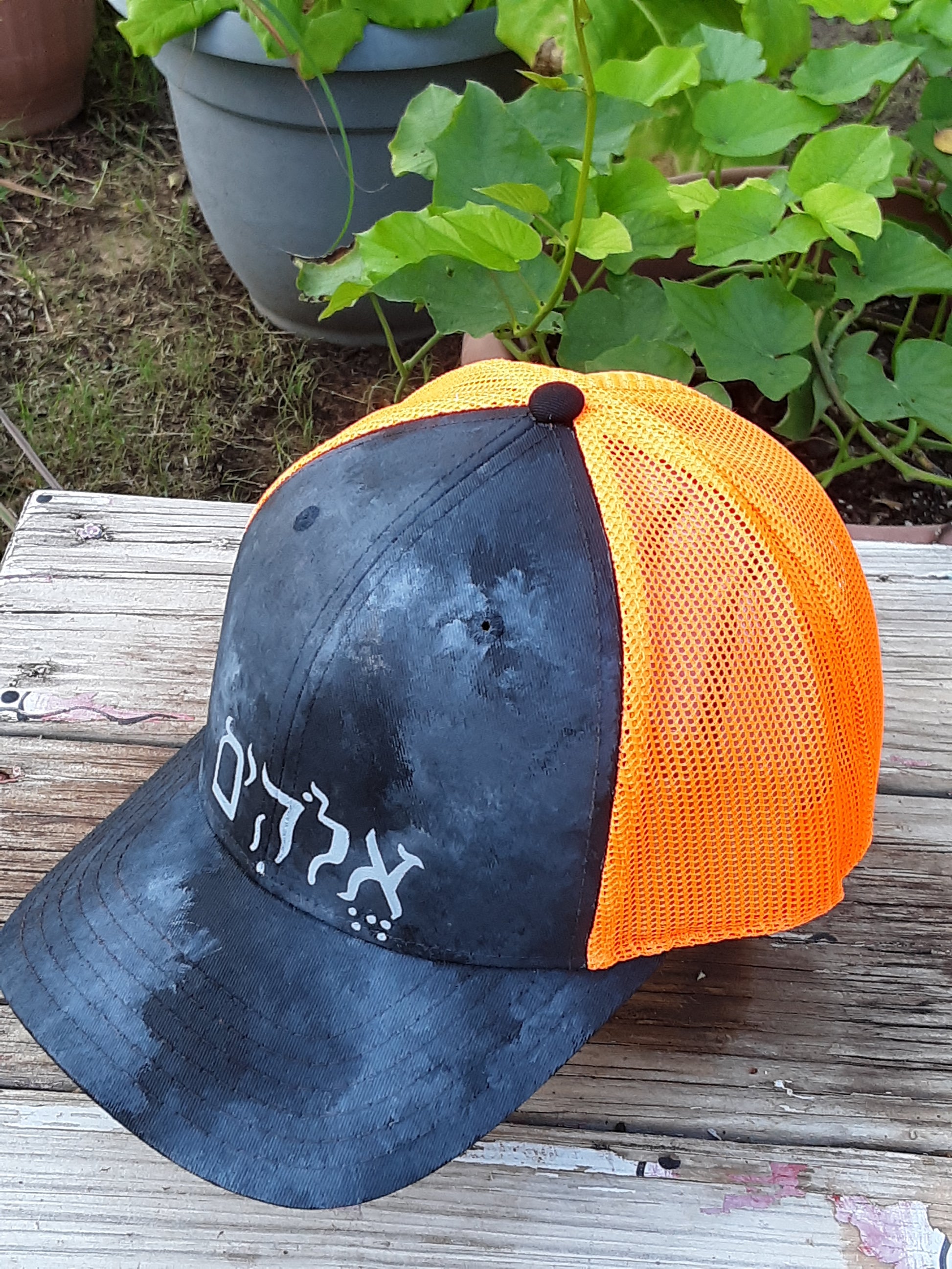 This stylish and unique Hebrew Font Elohim XXL Trucker Cap features the Hebrew name of God, Elohim, and is perfect for fans of modern fashion. This painted ball cap in blacks and grays also features a neon safety orange mesh back, ideal for hunting or outdoor enthusiasts.