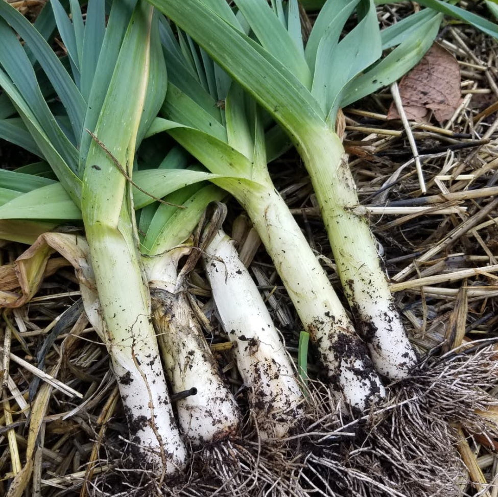 Scottish variety introduced in the early 1800s. Enormous leeks that are approximately 9-15" long by 2-3" in diameter. Tender white stalks, dark blue-green fan-shaped leaves. Mild flavor stands winter well. Good bunched for market gardens.
