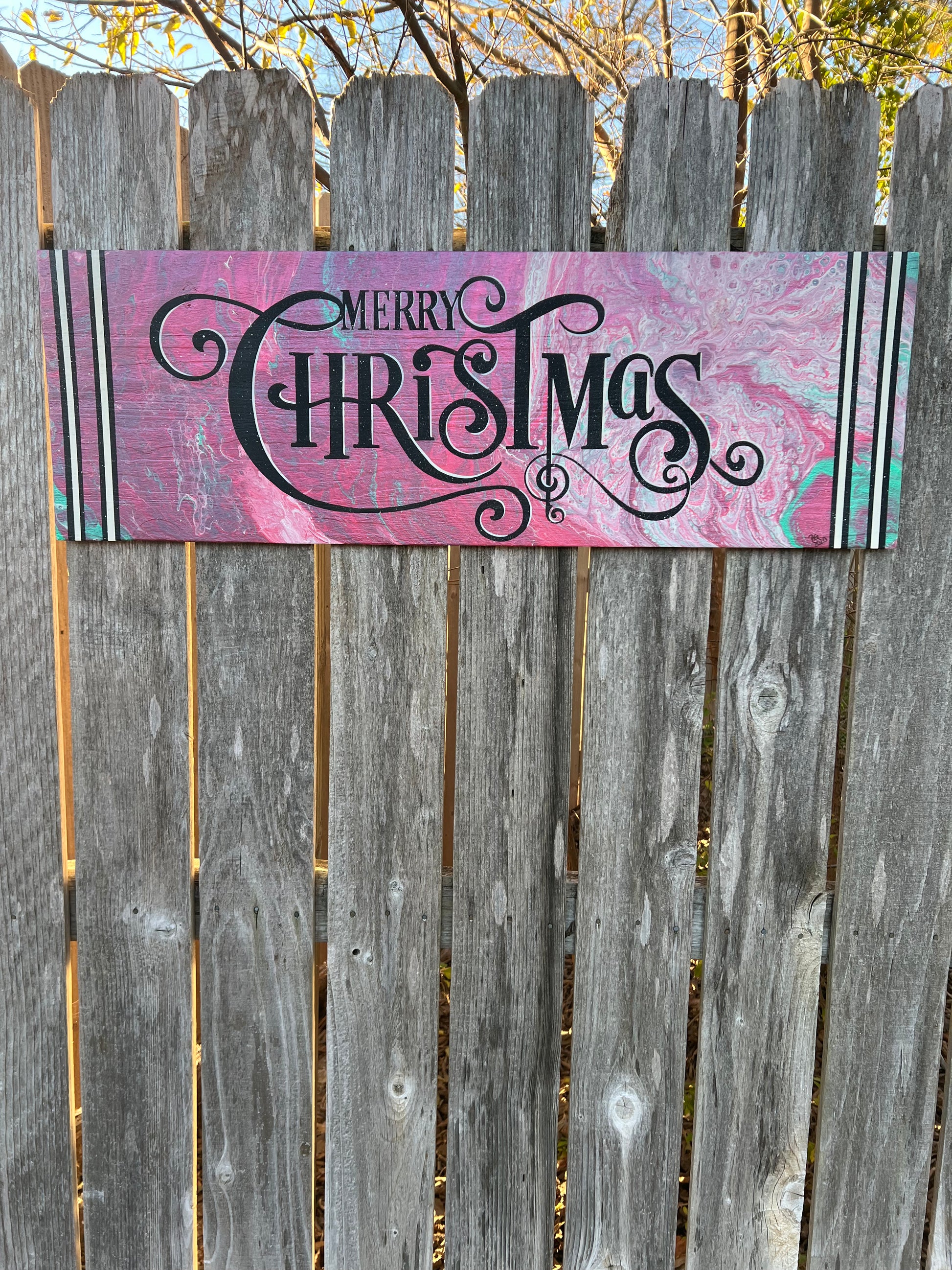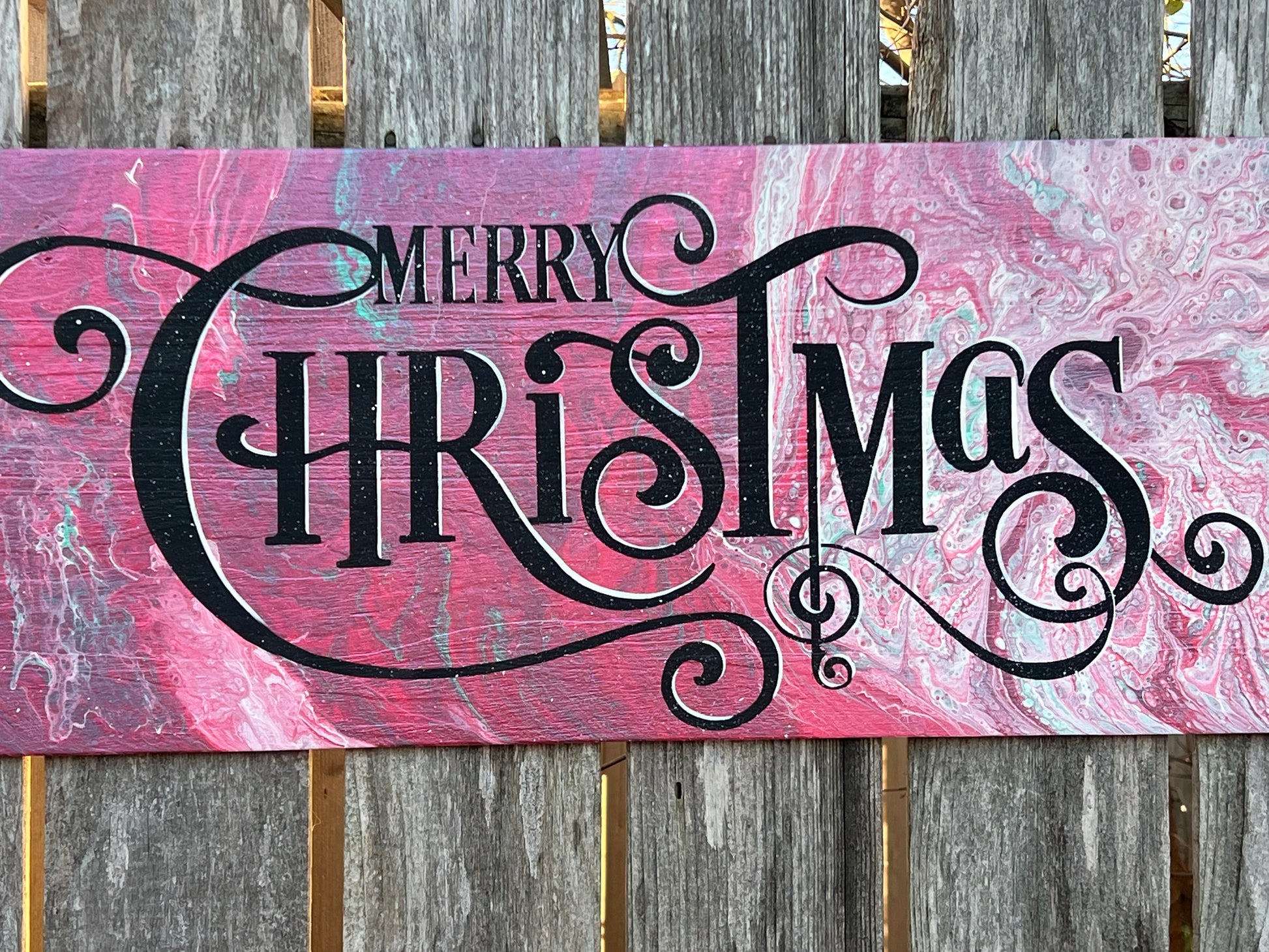 Merry Christmas pour paint sign. I did a pour paint of “metallic” Christmas colors for the background. Red, Green and White as a pour turned pink and beautiful! The sign is an original painting on pine wood approximately 36” long x 12” wide x 3/4” thick. Screws and wire was used on the back for hanging sign.