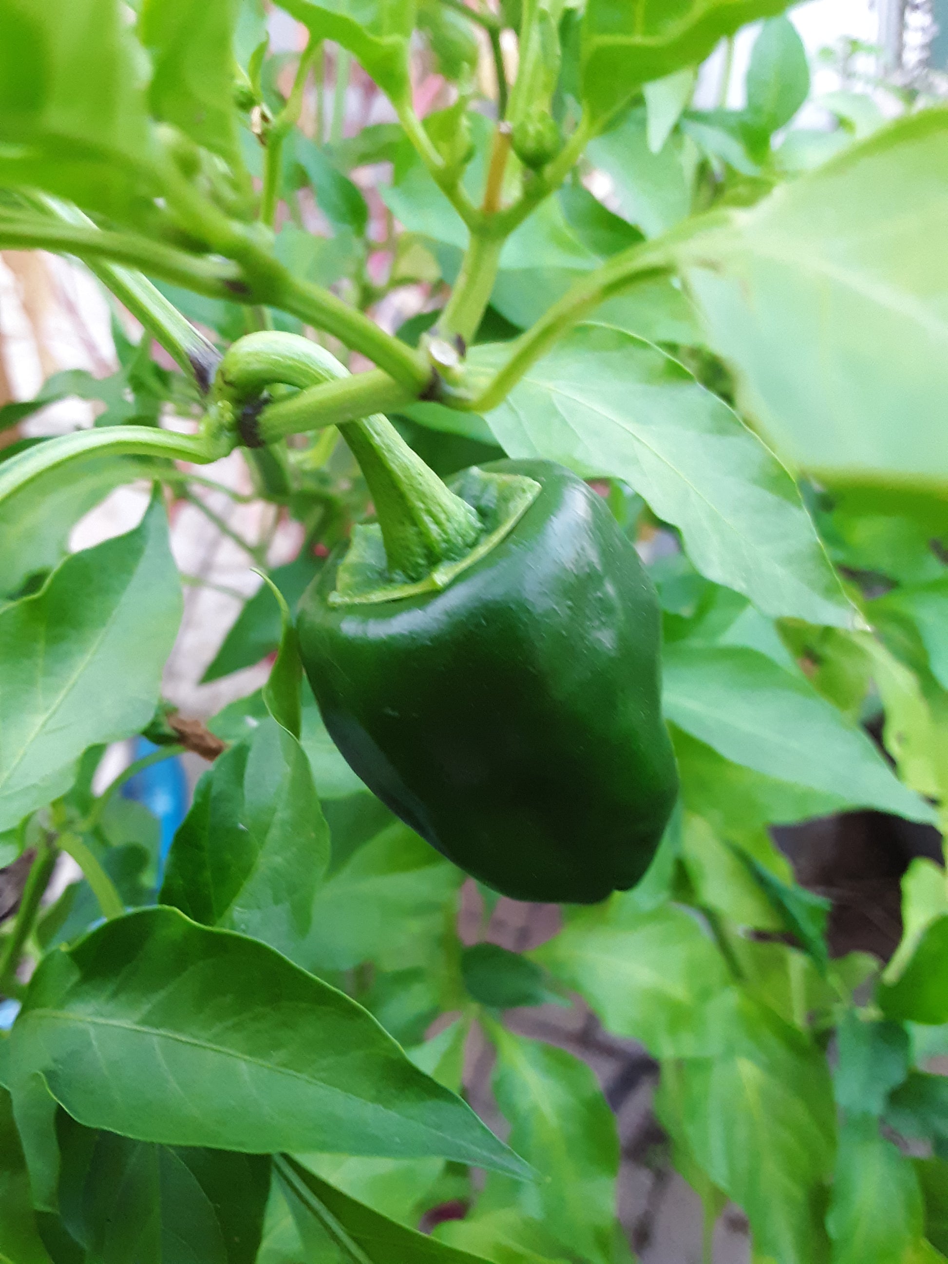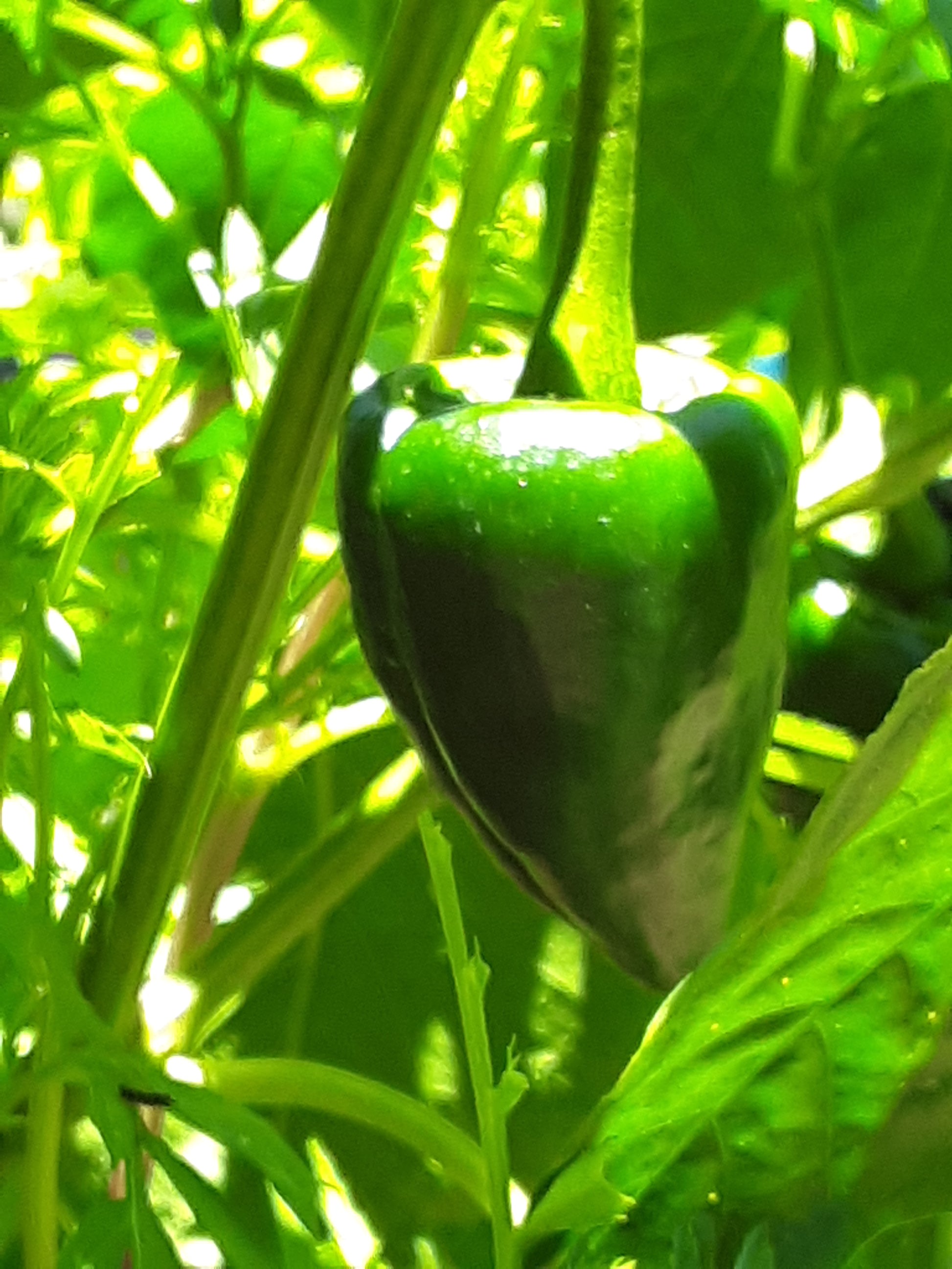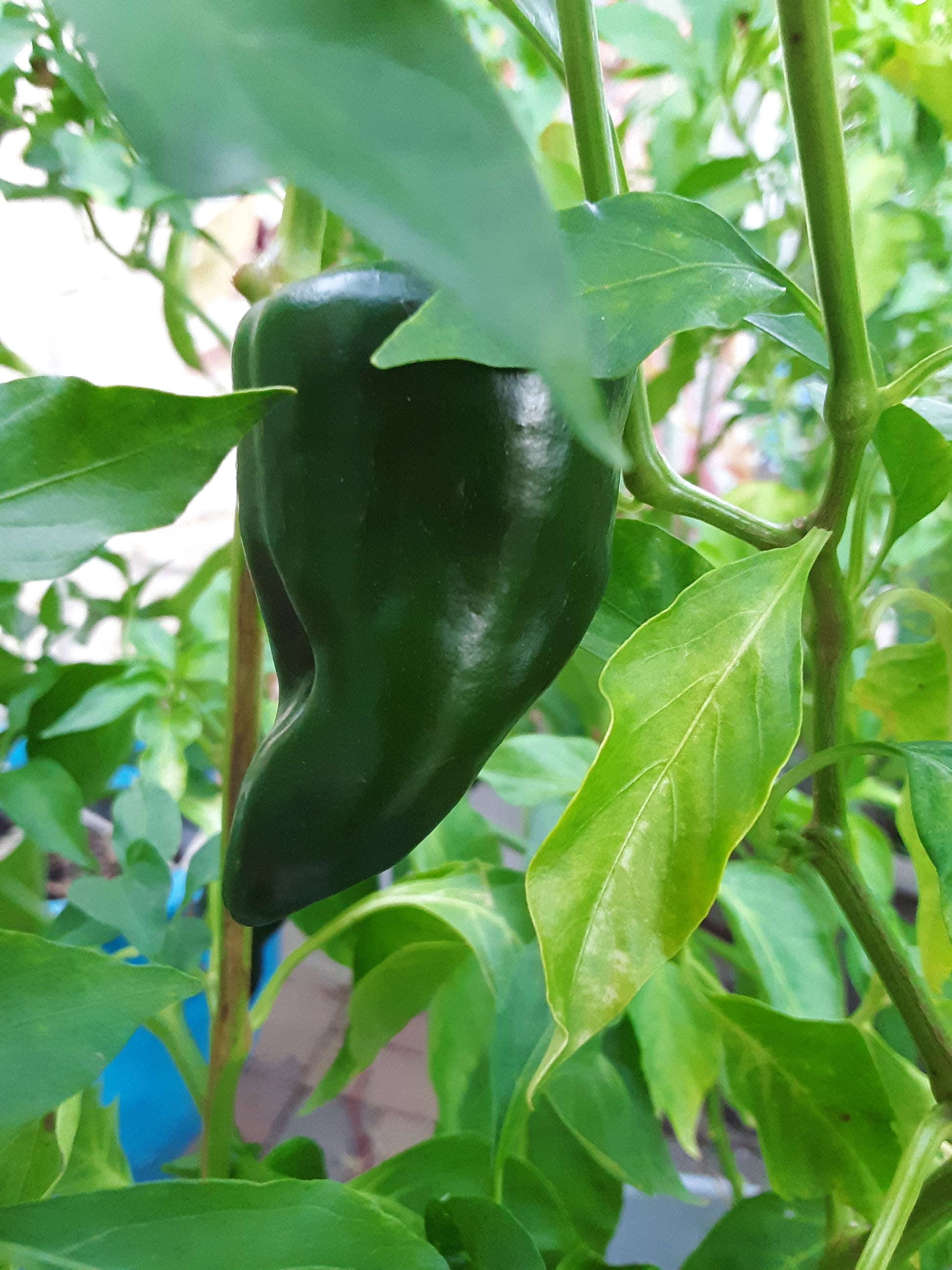 The pepper is usually harvested when it is a dark green color but some folks leave the peppers until they are red and spicier!
