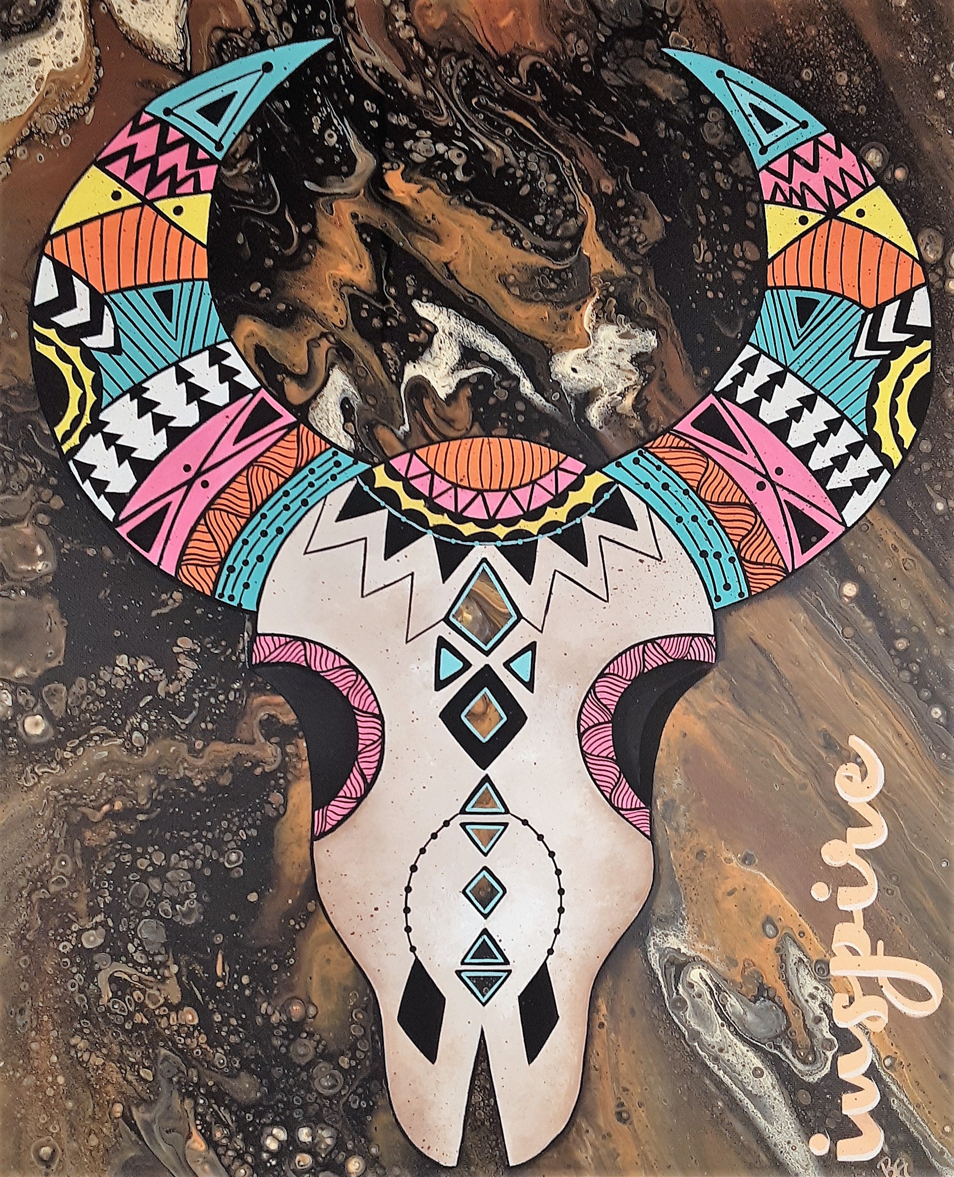 Acrylic painting 16" x 20" stretched canvas. The font word is "Inspire" and the background is a pour paint mix of earth tone colors.