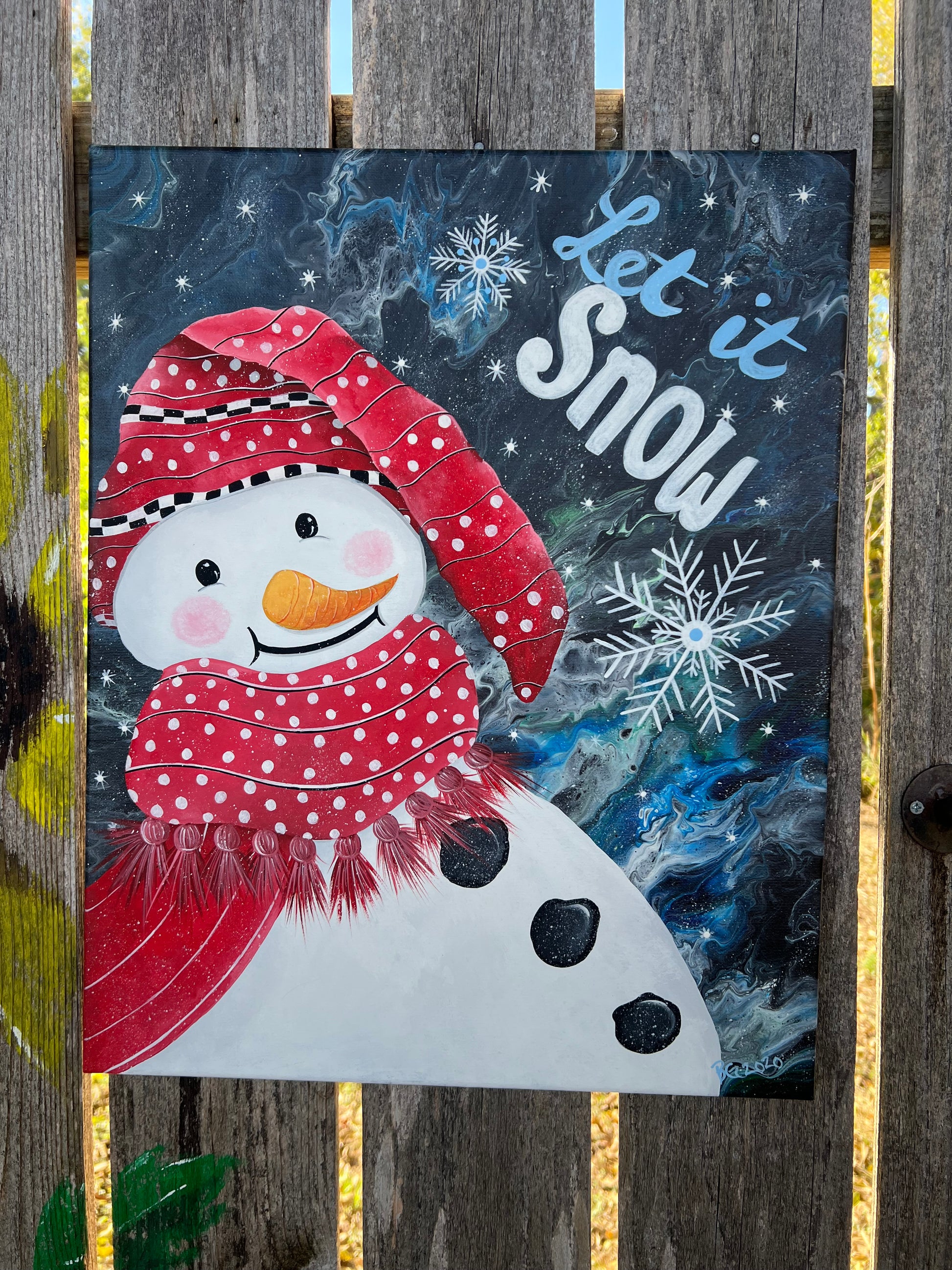 A cold winter's night with a very Jolly Snowman acrylic painting 16" x 20" stretched canvas. The words are "Let It Snow". The colors are black, white, blue, red, white, orange and pink.
